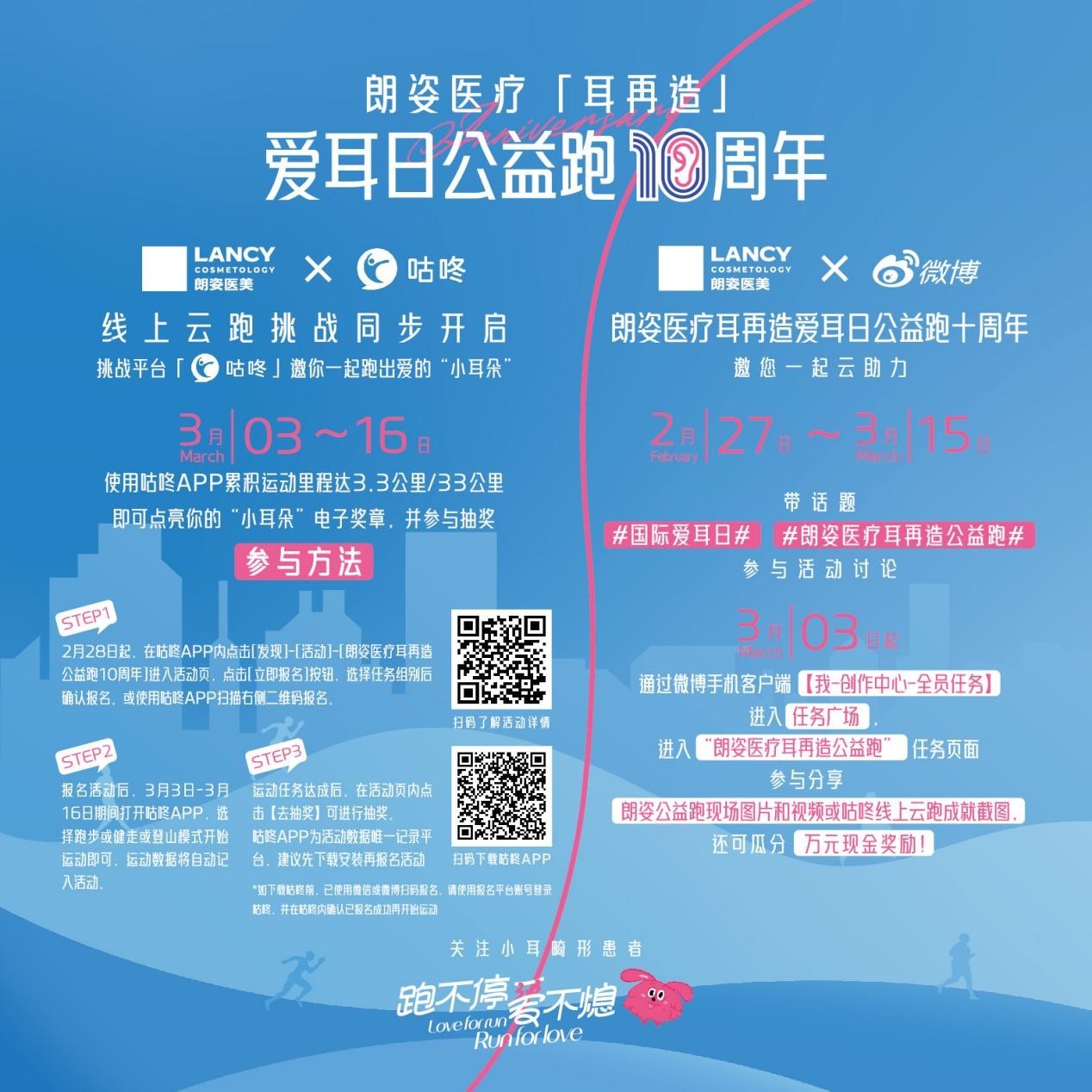 朗姿医疗「耳再造」公益跑10周年之际,朗姿医美首次特别联合两大爱心平台,打造线上云跑共同助力,并将爱意深远扩散。2月27日-3月15日,在新浪微博App带话题#国际爱耳日#、#朗姿医美耳再造公益跑# 参与活动讨论;3月3日起进入“朗姿医美耳再造公益跑”任务页面,参与分享朗姿公益跑现场图频或咕咚线上云跑成就截图,可瓜分万元现金奖励。3月3日-3月16日,进入咕咚运动App搜索耳再造公益跑,进入专题页面累积运动里程达3.3公里/33公里,即可点亮“小耳朵”电子奖章,并可参与抽奖。