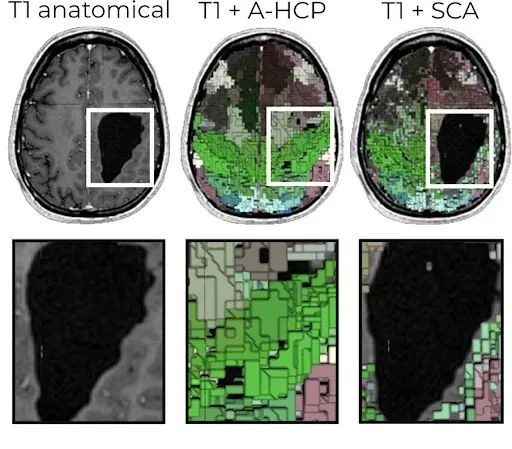 例如,肿瘤的生长可能会将周围的灰质推向其肿块效应的方向,但它很少会切断两个不同灰质区域之间的任何连接。通过利用扩散加权图像 (DWI) 来绘制解剖学扭曲的大脑中的白质,可以生成大致的“结构连接”。然后通过将这些白质束的起点和终点与健康的大脑进行比较,可以将灰质的体积(白质束的起点或终点)分配至可能性最高的大脑区域。这一过程的必然结果是,在手术切除该肿瘤的情况下,留下的空腔将正确地保持不被分配划分为任何大脑区域的一部分——因为它占据的体积将不包含任何神经组织。